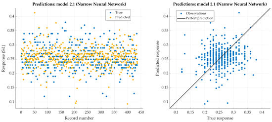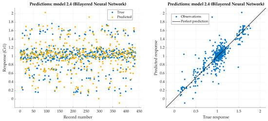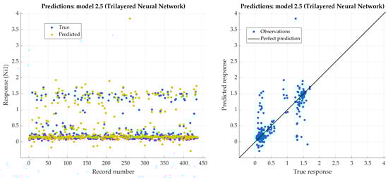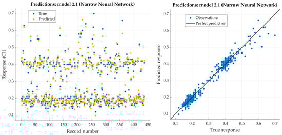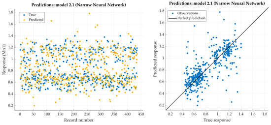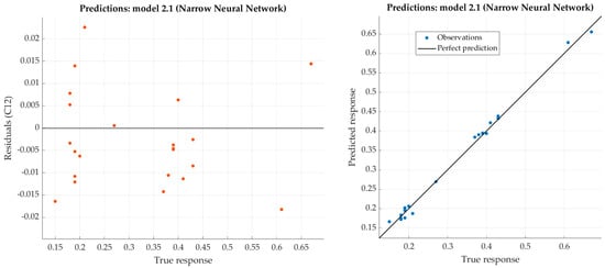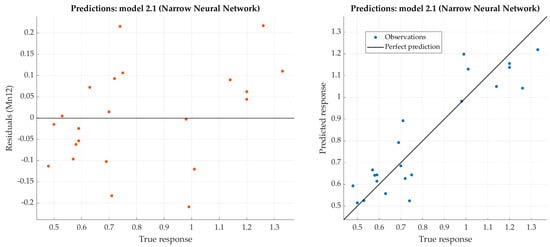 The narrow neural network model has the best results (with one hidden layer with 10 nodes). For that model, the predicted response vs. the experimental data for each observation (from the training dataset) is shown in Figure 4. For the same model, the predicted response vs. the experimental unseen data (the test dataset) is shown in Figure 5. In Figure 5, the relationship between residuals (difference between predicted response and experimental data) and true data is shown too. The best neural network model shows excellent results with very low RSME, as well as an extremely high R2 (close to 1).