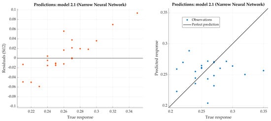 The narrow neural network has very low RSME, so one can conclude that the model is very good. At the same time, the coefficient of determination R2 is negative. By this definition, the coefficient of determination can be negative, but it shows that the regression performed poorly, even worse when the regression model explains none of the variability of the response data around its mean [,]. Nevertheless, residuals in Figure 9 show very small figures. This means that predicted values are similar to the experimental data and that the predicted data for silicon are within the given steel standard.