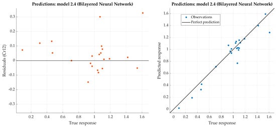According to the given criterion, the bilayered neural network model is chosen as the best (the neural network with two hidden layers with 10 nodes each). For this model, the predicted response vs. the experimental data for each observation from the training dataset is shown in Figure 10. For the same model, the predicted response vs. the experimental unseen data is shown in Figure 11. In Figure 11, the relation between residuals and true data is shown too.