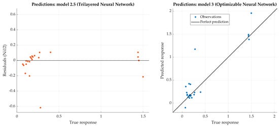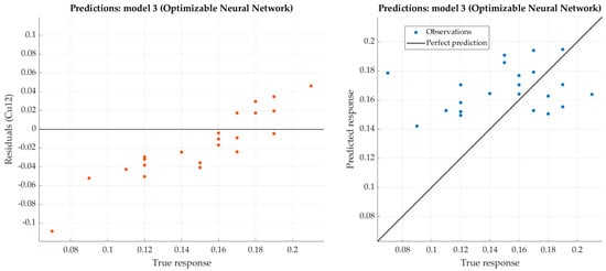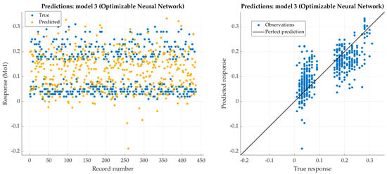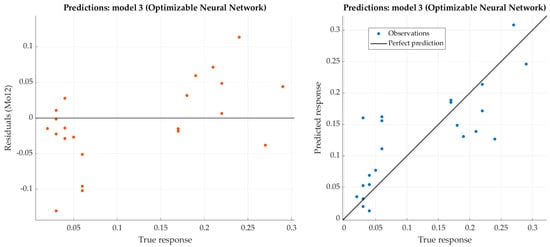 According to the given criterion, the optimizable neural network model is chosen as the best (neural network with two hidden layers, first with 295 nodes and second with 5 nodes). For this model, the predicted response vs. the experimental data for each observation from the training dataset is shown in Figure 14. For the same model, the predicted response vs. the experimental unseen data is shown in Figure 15. In Figure 15, the relationship between residuals and true data is shown too.