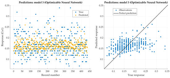 The Machine Learning and Deep Learning Toolbox from MATLAB R2023b software (MathWorks®), was utilized for regression tasks. Neural network regression models are trained using the Regression Learner App, with a 10-fold cross-validation implemented during training to prevent overfitting [,]. The model development process, including both training and testing phases, is conducted separately for each of the seven alloying elements. Five different architectures of artificial neural networks are employed for training: ‘trilayered’, ‘bilayered’, ‘narrow’, ‘medium’, and ‘wide’ networks, in addition to an optimized neural network. The specific architectures of these neural networks are as follows: