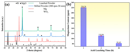 The XRD patterns in Figure 1a show the phases of the powder prepared by the mechanochemical method. After 30 min of ball milling with a speed of 300 rpm, the presence of W and MgO phases can be confirmed, while the diffraction peaks of WO3 and Mg have disappeared. This indicates that the reaction described in Equation (1) has occurred successfully. Subsequently, the milled powder was leached with hydrochloric acid solutions, and the MgO was removed completely according to the XRD diffraction peak analysis. The result from the inductively coupled plasma spectrometer in Figure 1b also shows that when the leaching time is 4 h, the content of the Mg element in the leached powder has decreased to about 100 ppm. Therefore, single-phase tungsten powder was obtained using the mechanochemical method at a relative moderate speed and short duration.