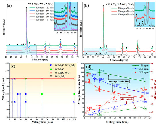 The XRD pattern of milled tungsten powder under different ball milling processes: (a) milled time; (b) milled speed; (c) phase evolution of milled powders; (d) average grain size (solid lines) and microstrain (dashed lines) of milled tungsten powder under different ball milling processes. The upper right corner of (a,b) show the enlarged light blue area.