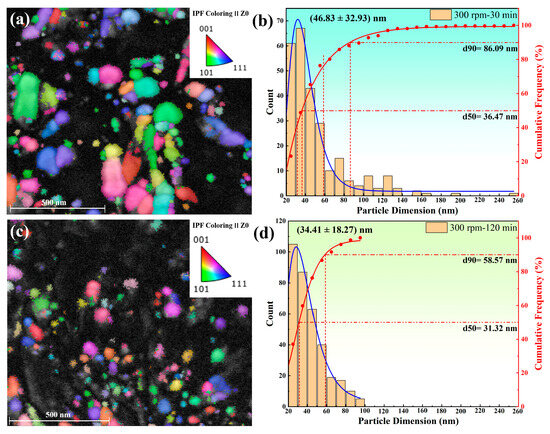 TKD image (BC+IPF) and grain size distribution of tungsten powder: (a,b) 300 rpm—30 min; (c,d) 300 rpm—120 min.