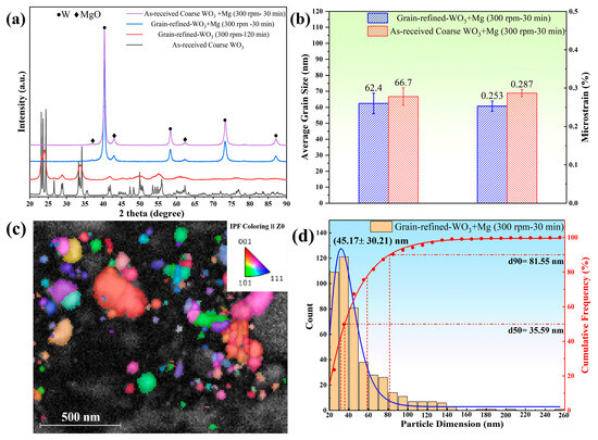 (a) The XRD patterns of as-received coarse WO3, grain-refined WO3, and two types of obtained milled tungsten powders; (b) average grain size and microstrain of milled tungsten powder, as determined by XRD patterns; (c,d) the TKD image (BC + IPF) and grain size distribution of tungsten powder.