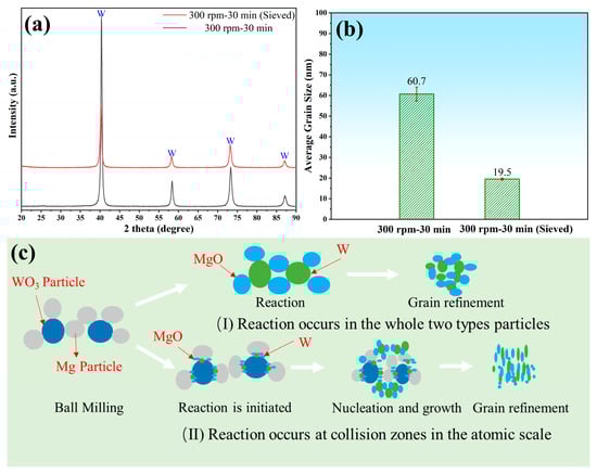 The effect of the average grain size of pristine reactant WO3 on the obtained tungsten powder product remains unknown. If the reduction reaction happens in the form of particles between WO3 and Mg, the final obtained tungsten powder should have a relation with the pristine reactant powders. Furthermore, a finer reactant size implies larger reaction surfaces, potentially enhancing reaction rates [34,35]. Nevertheless, there is no discernible difference in the average grain size and microstrain of the two final tungsten powders between those derived from grain-refined and as-received coarse WO3 powders (Figure 5). As previous research reported [29,32], during the mechanochemical process, the solid-state reaction is initiated by the collisions of surface atoms between WO3 and Mg particles in the spot contact regions of mechanical action, and the reaction productions can nucleate in the spot contact regions between colliding particles. Hence, a solid-state reaction typically occurs at collision zones in the atomic scale instead of two types of whole particles as illustrated in Figure 6c; Then, the effect of grain refinement of WO3 mainly plays a role in increasing reaction areas and collision possibility. However, the whole mechanochemical process can be separated into the reaction stage and milling-induced grain size refinement stage. And the reaction process is almost completed after several minutes of ball milling, which means that there is no obvious distinction between the two systems. Therefore, the products of tungsten powders in two systems undergo similar milling-induced grain refinement duration and show no obvious difference in grain size.