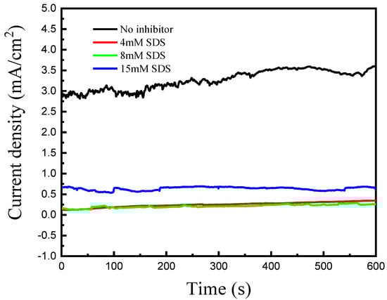 Figure 1 shows the effects of SDS contents on the galvanic corrosion behavior of Cu coupled to Au through the ZRA test. The contents of SDS were verified from 4 mM to 15 mM to confirm the optimum contents for the corrosion inhibition of Cu coupled to Au.