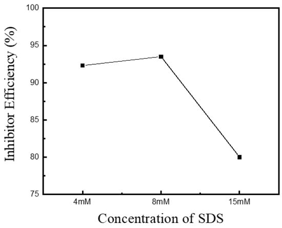 With further increase in the SDS contents to 15 mM, the galvanic corrosion current was measured to be 0.636 mA/cm2, which is an increased value compared with the contents under 8 mM SDS. The inhibitor efficiency was also decreased to 80.5% compared with the results of contents under 8 mM SDS. Figure 2 depicts the IE values according to SDS concentration. The comparison of the inhibitor efficiency with varying SDS concentrations reveals that the IE increased up to 8 mM but decreased beyond this concentration.