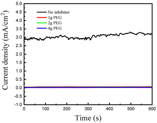 Upon the addition of SDS to a solution, the molecules initially disperse and adsorb individually onto metal surfaces. As the concentration of SDS increases and exceeds the critical micelle concentration (CMC), self-aggregation occurs, resulting in the formation of micelles. In these micellar structures, the hydrophobic tails converge within the core, while the hydrophilic heads orient outward, interacting with the aqueous environment. This self-assembly plays a crucial role in SDS’s behavior as a corrosion inhibitor [17]. The CMC of SDS is known to be 8.2 mM. Below 8.2 mM of SDS, SDS molecules effectively inhibit corrosion reactions by adsorption on metal surfaces. Beyond the CMC, the molecules begin to form micelles rather than adsorbing directly onto the metal surface. While micelle formation helps in surfactant stabilization in solution, it can reduce the availability of individual SDS molecules for surface adsorption [24]. Additionally, micelles may act as a barrier, altering the surface chemistry and reducing the effectiveness of the protective layer, which can re-expose the metal to corrosive agents, resulting in diminished inhibition [29,30]. To compare the galvanic corrosion inhibition effects of polyethylene glycol (PEG) content on copper coupled to gold, ZRA tests were conducted. The PEG concentrations ranged from 1 g/L to 4 g/L and were added to the etching solution to observe the effect on the galvanic corrosion inhibition of copper coupled to gold. Figure 3 shows a significant decrease in the copper galvanic corrosion current when PEG is added to the etching solution.