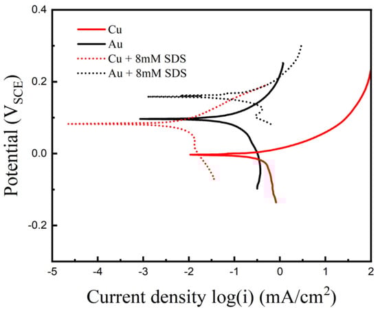 This adsorption creates a protective film that isolates the metal, thus inhibiting both the anodic and cathodic reactions responsible for corrosion. To study the influence of SDS as a corrosion inhibitor on the corrosion inhibition behavior of single copper and gold, a potentiodynamic polarization test was conducted in a PCB etching solution containing 8 mM SDS (Figure 5).