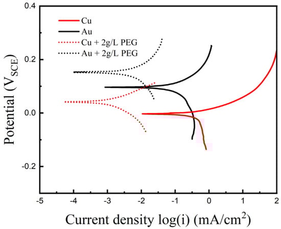 Polarization behaviors of single Cu and Au at 25 °C in the presence and absence of 2 g/L PEG of in PCB etching solution.