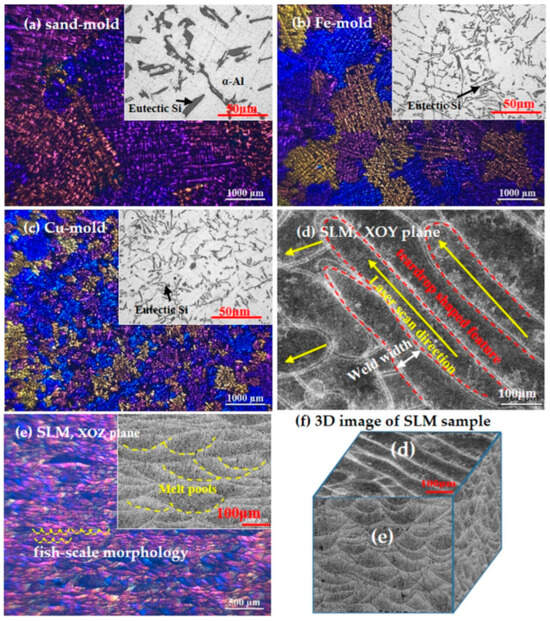 3.1.1. Microstructural Morphology of SLM Parts in Al Alloys