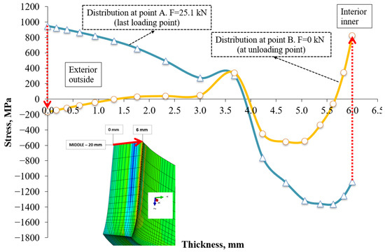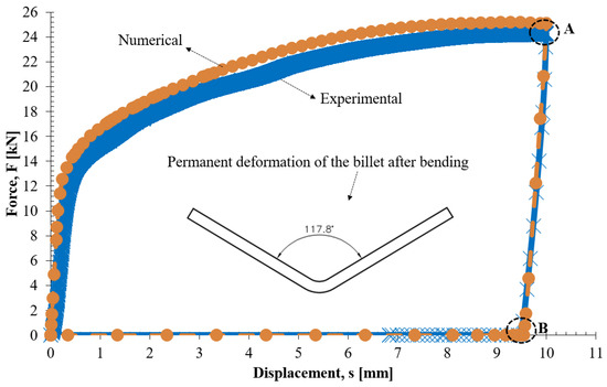 During numerical analysis of the bending, the reaction force between the punch and billet was recorded to obtain a numerical load vs. stroke curve. Figure 4 shows the force–displacement loop for the experimental and numerical data obtained during the 10 mm bending process. In the numerical analysis, the maximum deflection point (Point A) was achieved at Fmax = 25.1 kN, slightly higher than the experimentally obtained maximum bending point, as shown in Figure 4. It can be concluded that the numerical analysis was performed correctly, because both curves showed similar behaviour. Numerical simulation of the change in stress through the thickness was presented at different stages of loading of the billet, as was shown experimentally (Figure 4). The controlled numerical bending procedure consisted of two stages: the loading and unloading stages. During the loading stage, the area most distant from the neutral bending zone underwent permanent plastic deformation. In the unloading stage, the elastic portion of the material wanted to return to its initial state. However, the remaining plastically deformed portion of material prevented this, resulting in residual stresses.