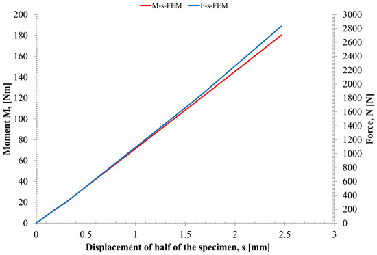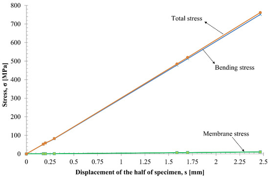 Even though the bending stress represented the maximum value, the stress state was determined on the basis of the determination of the range of forces to which the sample was subjected. The main reason is that, both in the numerical simulation and in experimental testing, the value of the sample’s opening force was a direct input.