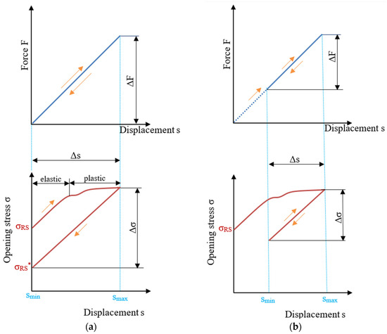 Loading with partial unloading (Figure 7b) represents the determination of the range of stress during fatigue loading with the loading ratio RF > 0. Loading started at the initial displacement of the bent billet and rose to the prescribed displacement smax, which was the displacement at maximum force Fmax, and unloading occurred at the prescribed displacement smin and force Fmin > 0, which were different from the initial (starting) displacement and force. During the loading stage, the stress changed in the same way as for loading with total unloading (Figure 7a), from the initial residual stress σRS as the starting point to the maximum stress σmax at the maximum displacement smax and force Fmax. The path of unloading and loading of stress with the same elastic slope as the initial elastic part was created with the minimum stress σmin at a displacement of smin and a force of Fmin. This slope depended on the geometry and size of the bent billet. This showed that stress ratio Rσ was different from the loading ratio RF, as in the case of RF = 0, Rσ > 0, and in the case of RF > 0, the stress loading ratio Rσ was >RF. It is obvious that effective stress can be based on determination of the range of stress Δσ, which is based on the range of loading force ΔF.