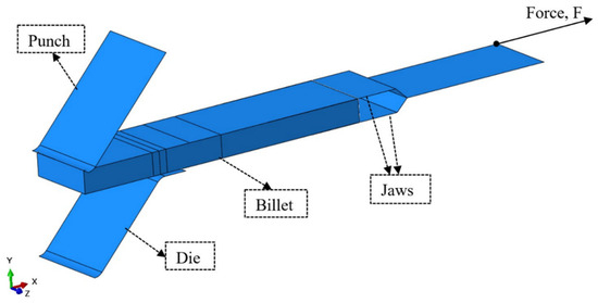 After the numerical bending simulation had been completed, the numerical simulation with fatigue loading continued uninterrupted, with the initial residual stress and loading range being the same as in the experimental part. Since the simulation of loading continued with the same finite element model, the same mesh was used as shown in Figure 9. After bending, the surface-to-surface contact was deactivated between the punch and billet, and between the billet and die. Surface-to-surface contact was established between the jaws, as an analytical rigid part, and the billet as a deformable solid, with formulation of rough friction and hard contact. The jaws had the same dimension as the jaws in the experimental fatigue loading with the INSTRON servo-hydraulic machine. The INSTRON actuator’s pin was simulated by applying force to the jaws, as shown in Figure 9, in the direction of the x-axis, fixed at the current position to enable the displacement U1 and the rotation UR3. The numerical bending simulations concluded with Step 3, and the simulation continued with fatigue loading in Step 4, as shown in Figure 15. Fatigue loading was performed with the same load ratio R = 0.1 and range, namely ΔF1 = 1.58 kN (Fmax = 1.759 kN), ΔF2 = 1.69 kN (Fmax = 1.893 kN), and ΔF3 = 2.54 kN (Fmax = 2.834 kN), as in the experimental part.