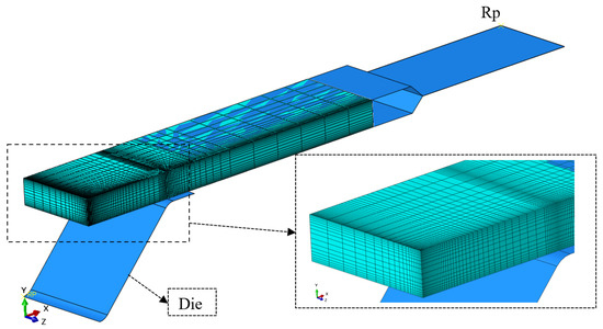 To develop the modelled stress–strain behaviour of the material and evaluate the residual stresses, a 3-point bending process with a 10 mm range of bending deflection was conducted as a strain-controlled process (Figure 8). The finite element bending model comprised the same-sized die, punch, and billet as the experimental part (Figure 2). In order to reduce the calculation time, only a quarter of the billet was modelled using x and z symmetry boundary conditions, as shown in Figure 8. The punch and die were modelled as analytical rigid parts, while the billet was modelled as a deformable solid. Surface-to-surface contact was considered between the punch and billet, and between the billet and die, with a friction coefficient of 0.05 between the mating surfaces. The model consisted of approximately 25,000 standard quadratic 3D hex elements, known as C3D20 (a 20-node quadratic brick), as shown in Figure 9. Different densities of the mesh were implemented. The highest mesh density was in the middle of the billet, where the deformation and residual stress were at the maximum values. Convergence was established by remeshing of the critical areas described and rerunning the numerical simulations (bending and fatigue to Step 10) until the results stabilized within 3%. The experimentally obtained stress–strain behaviour and properties of the material presented in Figure 1 were applied in the finite element analysis.