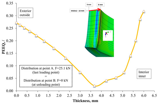 As shown in Figure 11, the distribution of the equivalent plastic strain PEEQ was identical for the loading stage (at Point A in Figure 4) and the unloading stage (at Point B in Figure 4). Figure 11 shows that the lowest PEEQ was achieved at a thickness of 3.7 mm, in an amount of 2%. During unloading of the bent billet, the elastic portion of the material tried to return to its initial state; however, the plastically deformed portion of the material prevented this, resulting in a permanently deformed position.