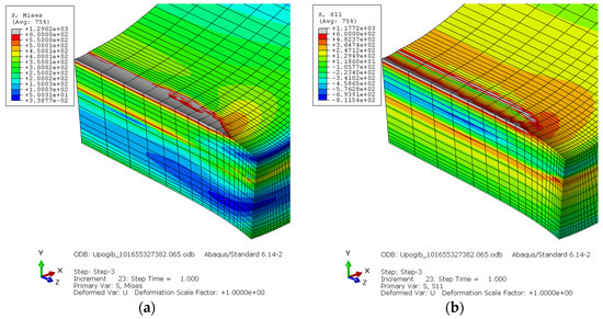 Distribution of von Mises (a) and S11 (b) residual stress on the bent billet.
