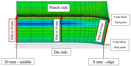 Residual stresses are essential in the fatigue life of the bent billet and affect the initial stress state at fatigue loading. The distribution of residual stress on the bent billet is shown in Figure 12 as the equivalent von Mises stress (yield criterion) and S11 stress, which opens the bent billet and initiates a fatigue crack during fatigue loading. The stresses were distributed throughout the cross-section of the bending billet. The highest level of residual stresses was located in the middle of the specimen, where the punch and billet, and the die and billet came into contact. The area inside the specimen (a small radius) contained the maximum strain and, consequently, the maximum residual stresses. After location of the maximum residual stress levels on the bent billet, the stresses were analysed along three paths through the middle cross-section, as shown in Figure 13. The first path was on the edge of the bent billet at 0 mm, the second path was at 10 mm from the edge (quarter of the width), and the third path was in the middle (at 20 mm). All the paths began on the die side (0 mm thickness) and went through the thickness of the bent billet to the punch side (6 mm thickness).