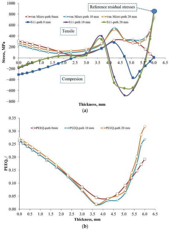 Distribution of residual stress (a) and PEEQ equivalent plastic strain (b) throughout the middle cross-section.