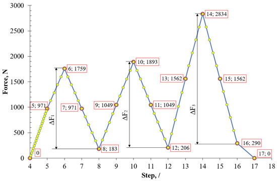 First, cyclic loading was carried out by loading to a mean force at Step 5, then to a maximum force at Step 6, unloading to a mean force at Step 7, and continuing unloading to a minimum force at Step 8. After finishing the first loading cycle, the remaining load cycles were carried out in the same way and ended with complete unloading to 0 N at Step 17.