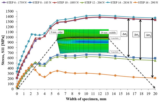 For each cyclic load (range), the distributions of the S11 stress along the internal bending line of the bent billet (the place with the highest stresses and strains) are shown in Figure 16. The region where the stresses are at their highest values was in the middle of the bent billet, which correlated with the fracture surface and the initiation of fatigue cracks. According to these findings, it can be concluded that the stress governed the initiation of fractures in a narrow area of the bent billet, which was in the middle at a thickness of 6 mm. For this critical point, the stress state was determined on the basis of the residual stress and combined tensile–bending cyclic loading under plane strain conditions.