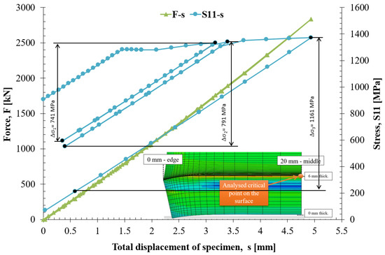The stress state during fatigue loading with the initial residual stress at the critical point on the bent billet is shown in Figure 17. The left-hand ordinate in the figure shows the applied force, and that on the right shows the opening S11 stress relative to the bent billet’s displacement on the abscissa. The force–displacement (F-s) curve was a characteristic of the load (green line) that began with the force value from the origin of the coordinates. Simultaneously, the correlation between the stress (S11) and the displacement (s) is shown, beginning with the displacement at 0 mm and the force at 0 N, with 907 MPa as the initial value of residual stress.