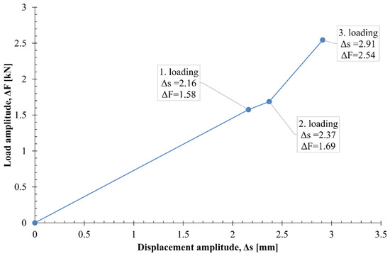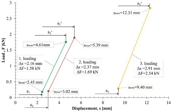 Combined tensile and bending cyclic loading was carried out at room temperature with a load ratio of R = 0.1 at a frequency of 5 Hz. Three sets of tests were carried out, with load ranges of ΔF1 = 1.58 kN (Fmax = 1.759 kN), ΔF2 = 1.69 kN (Fmax = 1.893 kN), and ΔF3 = 2.54 kN (Fmax = 2.834 kN), as shown in Figure 18. For each bent billet, the maximum and minimum displacements in relation to the force (load) and cycle were recorded during testing. The bent billet’s geometry changed during cyclic loading and was governed by the force and displacement of the actuator. Additionally, the geometry of a bent billet varied, depending on the set of fatigue loadings. With an increase in the maximal load and, consequently, the load’s range, the range of fatigue loading displacement of the bent billet increased (Δs), becoming tougher with the initial displacement of the actuator (a), as shown in Figure 19. Each fatigue loading set had a new starting point of loading for the actuator (a), a new displacement range (Δs), and a different starting angle of the bent billet. The third loading set had a significantly greater range of fatigue loading and a greater maximum load than the previous two loading sets, resulting in a large displacement of the actuator and consequent flattening of the bent billet. Increasing the actuator’s displacement at the third path of loading was a result of additional plastic deformation, which led to a reduction in the stiffness of the bent billet and increased the tensile stress.
