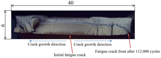 The experimental and numerical parts of fatigue loading were conducted under the same geometrical and loading conditions (range and ratio of loading). This enabled correlations between them and a description of the loading and stress state during fatigue loading. The findings of the experimental and numerical analysis indicated that the loading and stress state of the bent billet were influenced heavily by its displacement and degree of deformation (opening angle α), as shown in Figure 5, indicating that the bending moment and bending stress dominated fatigue loading. Figure 6 shows that bending stress was nearly the total stress on the bent billet, meaning that the bending component of the total applied load, which was a part of the bending moment, initiated the fatigue crack.