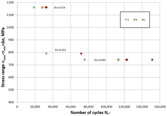 Fatigue loading was carried out with the applied load ratio R = 0.1, but as we have demonstrated in Figure 7, it was governed by displacement and the corresponding values of stress. The maximum stress remained almost a constant throughout all the loading cycles; however, the minimum stress decreased with each cycle, resulting in an increased range of stress. The increased range of stress caused a change in the stress ratio, which was distinct from the force–load ratio R = 0.1. As shown in Figure 17, the first cycle had a range of stress of Δσ1 = 741 MPa and a stress ratio Rσ of 0.444, while the second cycle had a range of stress of Δσ2 = 791 MPa and a stress ratio of Rσ = 0.411, and the third cycle had a range of stress of Δσ3 = 1161 MPa and a stress ratio of Rσ = 0.154. With increasing loading and displacement, the range of stress increased while the stress ratio decreased. It can be concluded that, during fatigue loading, it is necessary to include the initial residual stress at the critical point and the state of stress during fatigue loading itself to describe the state of stress in the bent billet.