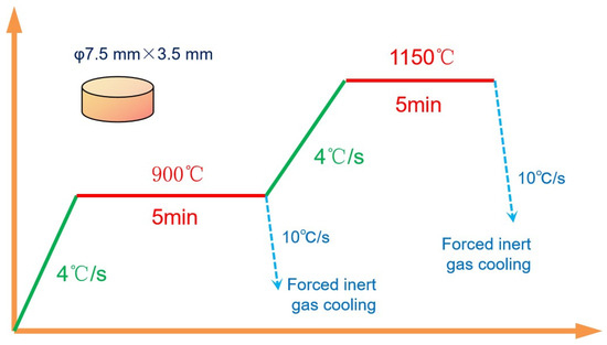 The heating and holding procedures for the in situ observation samples are depicted in Figure 2. The samples were initially heated at a rate of 4 °C/s to 900 °C and held at this temperature for 5 min. Subsequently, one group of samples was further heated to 1150 °C at the same rate and held for an additional 5 min before being rapidly cooled via forced inert gas cooling to room temperature at a rate of 10 °C/s. Another group was directly cooled to room temperature after the initial hold at 900 °C at the same manner.