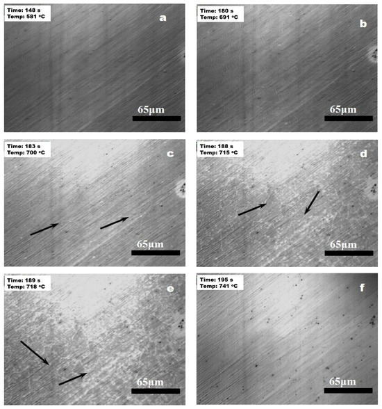 In Figure 3, the numbers in the top left corner indicate the time (seconds) and the real-time temperature (°C) of the sample. Initially, at temperatures below 580 °C, no significant microstructural changes were observed, indicating that the material remained stable within this temperature range. However, as the temperature reached 700 °C, the material began to enter the austenitization phase. Typically, grain boundaries, subgrain boundaries, and defects are common sites for nucleation. As shown by the arrows in Figure 3c,d, austenite nuclei initially formed along the grain boundaries, where the white dot-like formations can be observed along the boundary. These nuclei appeared as fine, discrete particles along the grain boundaries, highlighting the initial stages of austenite formation. As the temperature continues to rise, these austenite nuclei expanded and merged, forming a uniform austenitic structure, as depicted in Figure 3e. By approximately 740 °C, the microstructure was predominantly composed of austenite. The transformation to austenite within the temperature range of 700 °C to 740 °C was relatively rapid, occurring over approximately 12 s. This rapid transformation can be attributed to the high mobility of grain boundaries at elevated temperatures, facilitating the quick formation and growth of austenite grains.