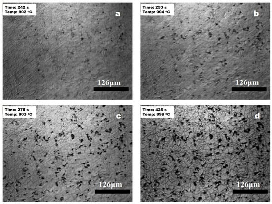 Figure 4 illustrates that the sample reached the set temperature of 900 °C after 240 s, at which point black precipitates began to appear (Figure 4a). As the holding time increased, the quantity of dark precipitates began to rise, as shown in Figure 4b, which depicts the in situ morphology of the dark phase after approximately 10 s of holding. Over time, the extent of the dark phase continued to increase, reaching its peak at around 30 s, as illustrated in Figure 4c. During the subsequent holding period, the number and distribution of the dark precipitates remained largely unchanged, as shown in Figure 4d. Furthermore, a comparison of Figure 4c,d reveals that the color in Figure 4d appears darker, suggesting a slight increase in the quantity of precipitates during the holding process. The dark appearance of these precipitates can be attributed to their interaction with trace amounts of gases in the observation chamber, which may have resulted in the formation of oxide layers on the precipitate surfaces. Additionally, the high resolution and in situ capabilities of HTCLSM allow for the real-time tracking of these microstructural changes, providing valuable insights into the kinetics of precipitation and growth mechanisms.