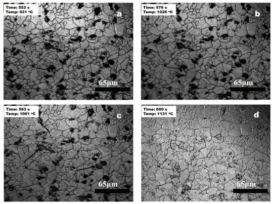 Microstructural evolution from 900 °C to 1131 °C: (a) 553 s; (b) 576 s; (c) 583 s; and (d) 600 s.