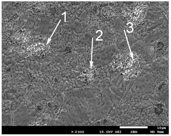 Figure 6 presents the SEM morphology of the sample, highlighting areas with dark precipitates. The elemental compositions of three specific positions marked by arrows in Figure 6 are detailed in Table 2.