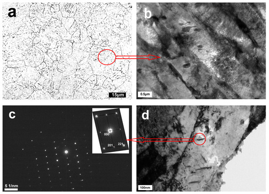 From Figure 9, it is evident that precipitates are formed and distributed within the grains, along the grain boundaries, and at the martensite lath boundaries, as illustrated in Figure 9a. Figure 9b,d show TEM micrographs where the precipitation particles are clearly visible. These images indicate that the particles tend to form at the boundaries and dislocations, which act as nucleation sites for the precipitates. The diffraction pattern in Figure 9c confirms that the particles are chromium carbides, specifically Cr7C3. The presence of Cr7C3, which is significantly harder than ordinary cementite, can substantially increase the steel’s strength. This is due to the fact that Cr7C3 carbides have a higher hardness and wear resistance, providing enhanced reinforcement to the steel matrix. Additionally, Cr7C3 precipitates impede dislocation movement, thereby increasing the material’s yield strength and hardness.