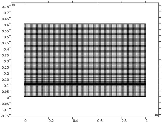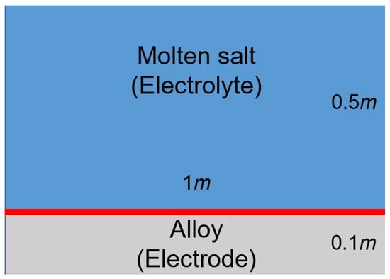 The model geometry is two-dimensional rectangular geometry, as shown in Figure 1. The blue shaded area is the electrolyte region (molten salt), and all reactions are set to occur at the bottom of that region, at the interface with the electrode (alloy).