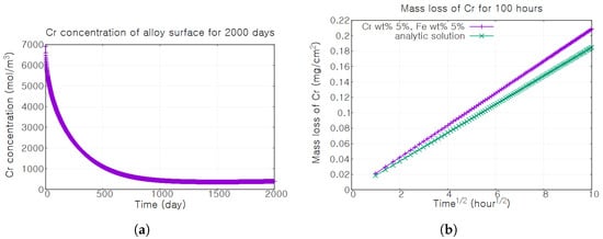 The progression of the corrosion is clear from the Cr concentration at the surface over time, as shown in Figure 3a. There is rapid Cr depletion at first, but it slows with time. After 1500 days, there is little corrosion progression and at 2000 days, the surface Cr concentration reaches mol/, or a mass fraction of 0.002878; we used this value as the steady state in the analytical model. is assumed to /, which is the Ni–5Cr alloy density []. The Cr mass loss by the surface reaction-diffusion-coupled simulation is visualized in Figure 3b along with the analytical prediction by Equation (15). The mass loss of Cr with simulation is 13% larger than the analytic solution on average. The root mean square error between two curves is /cm2, indicating reasonable accuracy.