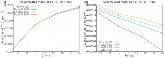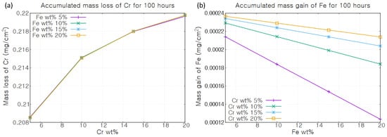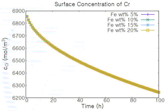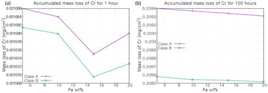 As shown in Figure 7, after 1 h, the Cr mass loss for Case A is 0.025% larger than that for Case B on average. After 100 h, the Cr mass loss of Case A is 0.387% larger than Case B on average. The effect of Fe concentration on the amount of Cr corrosion was relatively insignificant. As shown in Figure 8, the average Cr concentration over the surface decreased by 8.9% over 100 h from the start of corrosion, while the effect of Fe concentration in the material was not noticeable.