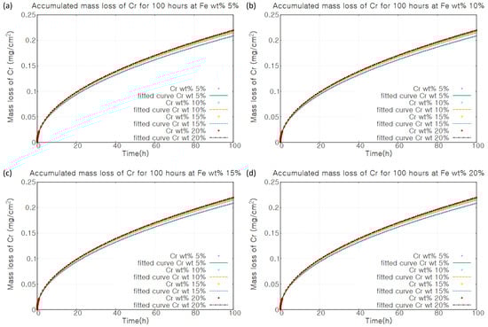Fits of the mass loss of Cr versus time (a) 5 wt% Fe; (b) 10 wt% Fe; (c) 15 wt% Fe; (d) 20 wt% Fe. Maximum error of the fits is 0.0004036 mg/cm2.