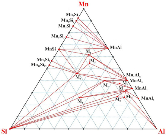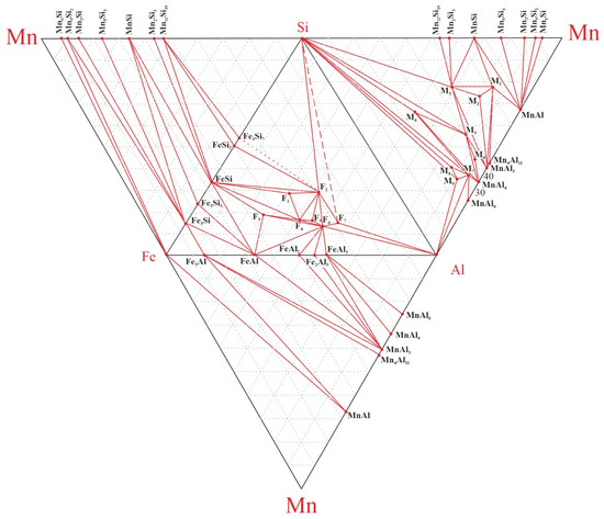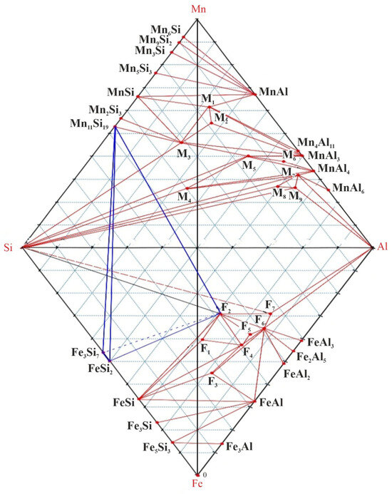 Based on the tetrahedra of four particular three-component systems, Fe-Si-Al, Si-Mn-Al, Fe-Mn-Si, and Al-Mn-Fe, a diagram of the phase composition of the four-component system Fe-Si-Mn-Al was constructed (Figure 5). Table 7 presents a list of all elementary triangles of the studied systems.