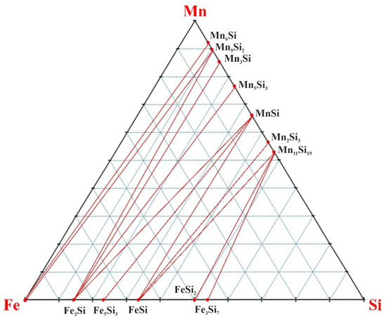 There is no information about the presence of Fe-Mn-Si ternary compounds. When triangulating the Fe-Mn-Si subsystem, thirteen areas were formed from the double phase diagrams of Fe-Mn, Fe-Si, and Mn-Si: (1) Fe-Mn-Mn6Si; (2) Fe-Mn6Si-Mn9Si2; (3) Fe-Mn9Si2-Fe3Si; (4) Fe3Si-Mn9Si2-Mn3Si; (5) Fe3Si-Mn3Si-Mn5Si3; (6) Fe3Si-Mn5Si3-MnSi; (7) Fe3Si-MnSi-Fe5Si3; (8) Fe5Si3-MnSi-FeSi; (9) FeSi-MnSi-Mn2Si3; (10) FeSi-Mn2Si3-Mn11Si19; (11) FeSi- Mn11Si19-FeSi2; (12) FeSi2-Mn11Si19-Fe3Si7; (13) Fe3Si7-Mn11Si19-Si (Figure 3).
