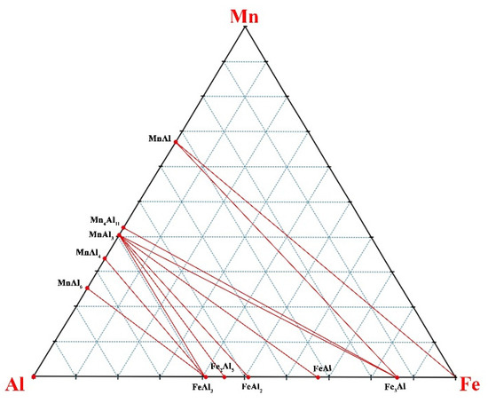 There is also no information about the presence of ternary compounds in the Al-Mn-Fe system. When triangulating the Al-Mn-Fe subsystem, eleven areas were formed from the double phase diagrams of Al-Mn, Fe-Mn, and Fe-Al: (1) Al-MnAl6-FeAl3; (2) MnAl6-MnAl4-FeAl3; (3) MnAl4-MnAl3-FeAl3; (4) MnAl3-Fe2Al5-FeAl3; (5) MnAl3-FeAl2-Fe2Al5; (6) MnAl3-FeAl-FeAl2; (7) MnAl3-Fe3Al-FeAl; (8) MnAl3-Mn4Al11-Fe3Al; (9) Mn4Al11-MnAl-Fe3Al; (10) MnAl-Fe-Fe3Al; (11) MnAl-Mn-Fe (Figure 4). Thus, the values of the enthalpy of formation in the Si-Mn-Al ternary system were calculated using the additive method. Binary systems (Fe-Si, Fe-Mn, Fe-Al, Mn-Si, Al-Si, Al-Mn) and ternary (Fe-Si-Al, Si-Mn-Al, Fe-Mn-Si, and Al) systems were considered.