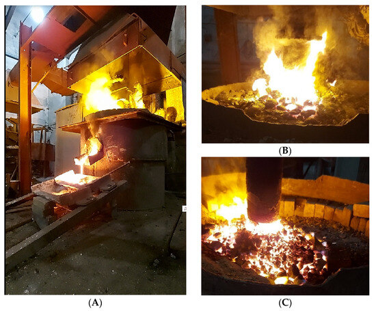 The process of melting a complex alloy in an ore-thermal furnace with a transformer power of 200 kVA. (A) general view of the ore-thermal furnace; (B,C) appearance of the flue.