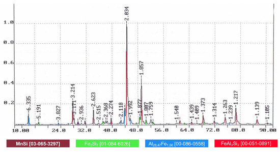 In alloy samples of compositions № 7 (Figure 8) and № 14 (Figure 10), iron aluminosilicide—FeAl3Si2, manganese silicide—Mn11Si9, leboite—Fe3Si7, and structurally free silicon were found, which is explained by the high silicon content in the alloy.