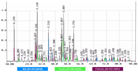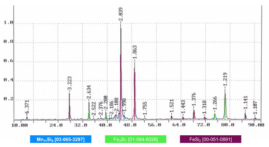 In the alloy sample of composition № 9 (Figure 9), the following phases were identified: leboite (Fe3Si7), which extends towards iron silicide FeSi2, iron aluminosilicide—FeAl3Si2, and manganese silicide—Mn11Si9. As we described above, samples of sample № 9 crumbled, so we assume that this is affected by leboite—Fe3Si7, which after crystallization passes into FeSi2, and in other samples (№ 7 and № 14), pure silicon affects and does not allow crumbling. The X-ray phase analysis method allowed us to identify the main crystalline phases in the alloy under study, their effect on the physical and mechanical properties of the material, and confirm the correctness of the thermodynamic diagram analysis of the obtained data.