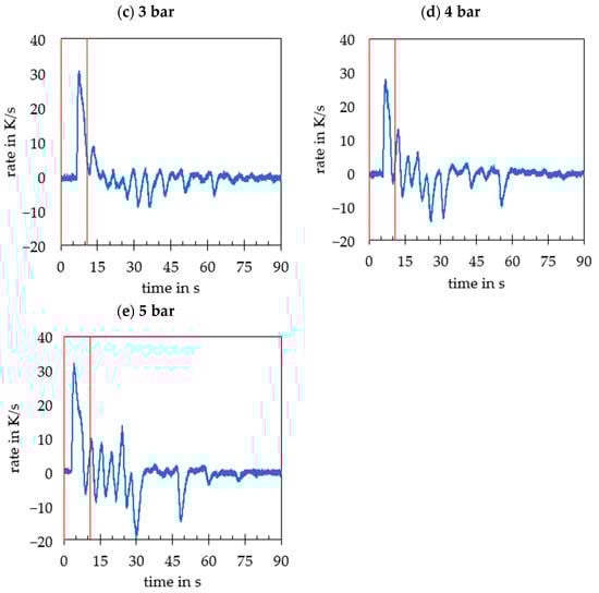 Figure 10 clearly shows the influence of increasing pressure. In general, an increase in pressure leads to an increase in the cooling rates close to the cavity and a shift in the initial time of cooling to an earlier point. While at 1 to 3 bar, the maximum cooling rates are between—8.3 and 9.4 K/s, the further increase in pressure from 3 to 4.5 bar leads to a strong increase in the cooling effect, which continues to a lesser extent when the pressure is increased to 5 bar.