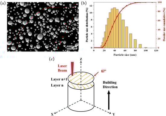 (a) SEM micrograph of NiTi powder. (b) Powder particle size distribution. (c) Scanning strategy of 67° inter-layer rotation angle.