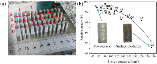 (a) Samples obtained with different printing parameters. (b) Variation of relative density of samples with energy density.